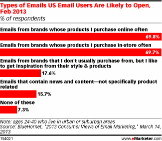 从邮件营销服务提供商BlueHornet的数据来看,熟悉的名字对于邮件打开率的影响也相似。在针对美国用户的调查中,他们发现约有7成的用户表示,他们倾向于打开那些发自他们经常在网络或实体店购买的品牌的邮件。